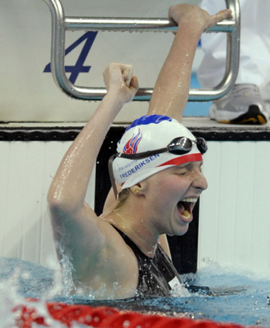 Heather Frederiksen of Britain celebrates after winning the women's 100m backstroke S8 final during the 2008 Beijing Paralympic Games at the National Aquatics Center in Beijing on September 10, 2008. Heather Frederiksen won with a new world record of 1:16.74. [Agencies]
