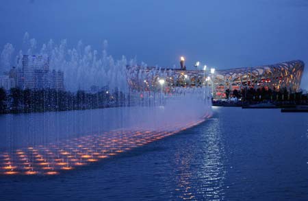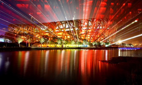 Photo taken on Aug. 22, 2008 shows the nightscape of the National Stadium, also known as the Bird's Nest, in Beijing. The Olympic Green enjoys a beautiful night view shining with colors and lights during the Beijing 2008 Olympic Games. [Xinhua]