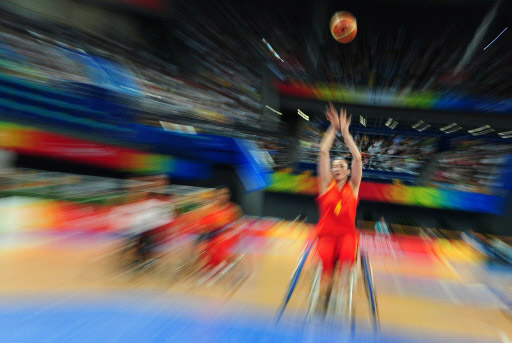 China's Zhang Santao shoots from the free throw line against Canada in their women's wheelchair basketball preliminary match during the 2008 Beijing Paralympic Games on September 10, 2008 at the National Indoor Stadium in Beijing. [Agencies]