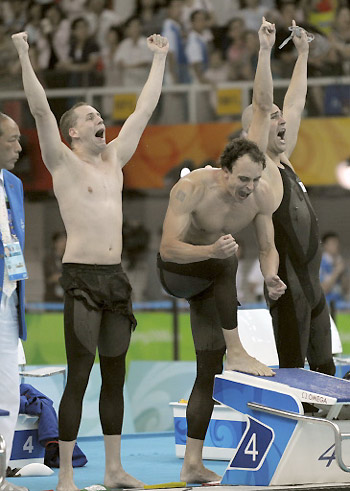 British swimmers (from L to R) Matthew Walker, Graham Edmunds and David Roberts are elated after winning the men's 4x100m freestyle 34PTS during the 2008 Beijing Paralympic Games at the National Aquatics Center in Beijing on September 10, 2008.[Agencies]