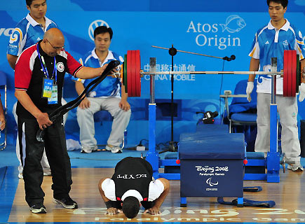 Egypt's Sherif Othman kisses the floor after his third consecutive attempt where he set the world and paralympic records in the men's 56kg powerlifting event at the 2008 Beijing Paralympic Games on September 11, 2008 at the BUAA Gymnasium in Beijing. Othman broke and set the world and paralympic records with three consecutive lifts beginning with 195.0 kg, followed by 200.0 kg and finally on his last attempt with 202.5 kg to win the gold medal. [Agencies]