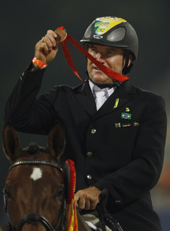 Marcos Alves of Brazil riding Luthenay de Vernay celebrates with his bronze medal after competing in the equestrian individual freestyle test grade 1b at the Beijing 2008 Paralympic Games in Hong Kong September 11, 2008. [Agencies]