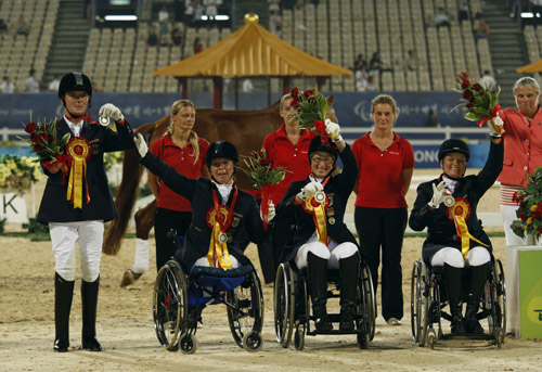 Members of Germany's Paralympic Games equestrian team (L-R) Steffen Zeibig, Angelika Trabert, Britta Naepel and Hannelore Brenner celebrate with their silver medals of the overall team award at the Beijing 2008 Paralympic Games in Hong Kong September 11, 2008. [Agencies]