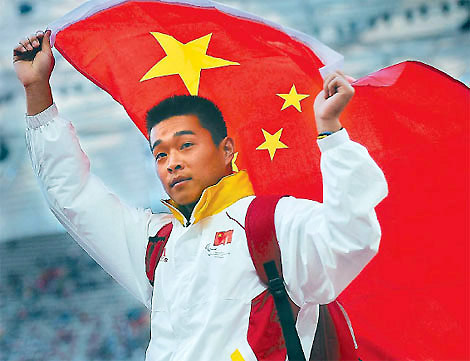 Guo Wei holds the Chinese national flag after winning the men's discus throw F35/36 at the National Stadium, also known as the Bird's Nest, at the Beijing 2008 Paralympic Games September 11, 2008.
