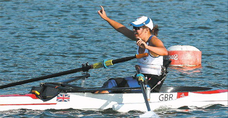 Helene Raynsford of Great Britain celebrates her gold medal in the women's single sculls at the Shunyi Olympic Rowing-Canoeing Park September 11, 2008.