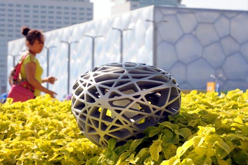 A pedestrian passes by a "little bird's nest" in this photo taken on September 10, 2008. More than 1,700 such stylish lamps, resembling the shape of the iconic structure, are fixed around the National Stadium, or the "Bird's Nest". [Xinhua]