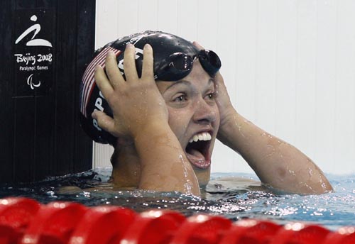 Erin Popovich of the U.S. celebrates winning the women's 100m breaststroke SB7 finals during the Beijing 2008 Paralympic Games September 9, 2008. [Agencies]