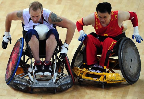 Cheng Shuangmiao (R) chases Chance Sumner of the US (L) in their mixed wheelchair rugby game at the 2008 Beijing Paralympic Games on September 11, 2008 at the USTB Gymnasium in Beijing. US defeated China 65-30. [Agencies]