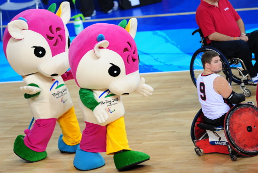 Paralympics mascots LeLe, the female cow, take to the court during a timeout behind Nick Springer of the US in a game against China in their mixed wheelchair rugby game at the 2008 Beijing Paralympic Games on September 11, 2008 at the USTB Gymnasium in Beijing. US defeated China 65-30. [Agencies]