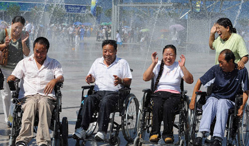 Spectators play with the music fountains in front of the National Stadium, or the Bird’s Nest during the 2008 Beijing Paralympic Games September 11, 2008. [Xinhua]