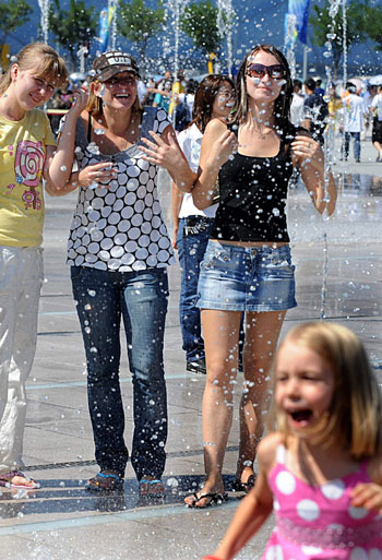 Foreign spectators play with the music fountains in front of the National Stadium, or the Bird's Nest during the 2008 Beijing Paralympic Games September 11, 2008. [Xinhua]