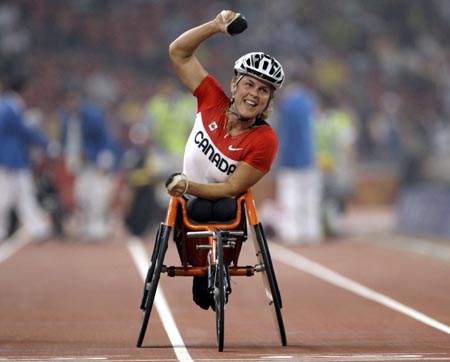 Canada's Diane Roy celebrates winning the final of the women's 5000m T54 at the National Stadium, also known as the Bird's Nest, during the Beijing 2008 Paralympic Games September 8, 2008. [Agencies]