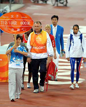 A volunteer guides athletes at the National Stadium Sept. 10, 2008. [Xinhua]