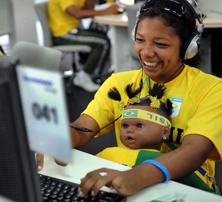 An unidentified Brazilian Paralympian carrying a baby toll on her legs smiles as she surfs on the Internet in an Internet Café at the Beijing Paralympic Village on Sept. 5, 2008. [Xinhua]