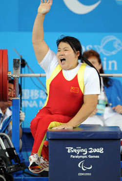 Chinese powerlifter Bian Jianxin celebrates after lifting 135kg to claim the gold medal of the women's 60kg category and break the world record at the Beijing Paralympics on Sept.13, 2008. [Xinhua]
