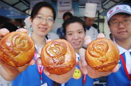 Paralympic volunteers showcase their self-made "volunteer moon-cakes" at the volunteers'desk at Xidan subway station in Beijing Sept. 11, 2008. The moon-cake is a kind of traditional food that Chinese people eat on the Mid-Autumn Day, which falls on the 15th day of the eighth lunar month. [Xinhua]