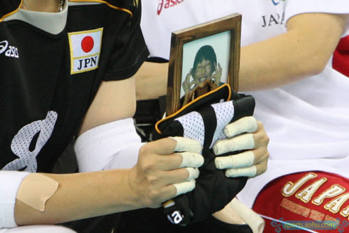 A Japanese athlete holds up a photo of her late teammate when competing in sitting volleyball match during the Beijing Paralympic Games, September 13, 2008. The 21-year-old girl, former member of Japanese sitting volleyball team, had a dream of taking part in the Beijing Paralympics but passed away on August 12, 2008.[Sohu.com]