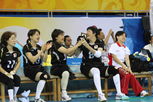Two Japanese athletes hold up a photo of their late teammate when competing in sitting volleyball match during the Beijing Paralympic Games, September 13, 2008. The 21-year-old girl, former member of Japanese sitting volleyball team, had a dream of taking part in the Beijing Paralympics but passed away on August 12, 2008.[Sohu.com]
