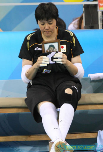 A Japanese athlete holds up a photo of her late teammate when competing in sitting volleyball match during the Beijing Paralympic Games, September 13, 2008. The 21-year-old girl, former member of Japanese sitting volleyball team, had a dream of taking part in the Beijing Paralympics but passed away on August 12, 2008.[Sohu.com]