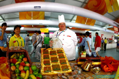 A staff member of the Paralympic Village cafeteria poses with mooncakes as the Mid Autumn Day (a traditional Chinese festival featuring family reunions) falls on Sunday. [sohu.com]