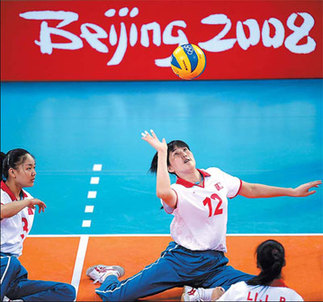 China's Sheng Yuhong (No 12) strikes during the women's sitting volleyball final against USA. The host won 25-14, 25-19, 25-15. [Xinhua]