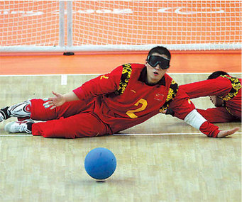 China's Cai Changgui blocks the ball during the men's goalball final match against Lithuania. China won 9-8. [China Daily]