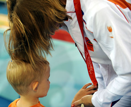 A sitting volleyball player of the Netherlands shares the victory with her little son after the medal ceremony, September 14, 2008. The Netherlands beats Slovenia to win the bronze in women’s sitting volleyball competition.[Xinhua]