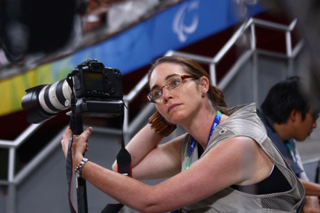 A female photographer takes a break amid the competition at the Bird’s Nest during the 2008 Beijing Paralympics, September 11, 2008. A lot of female photographers hold heavy cameras to shoot with their unique perspective during the Beijing Paralympics.[Xinhua]
