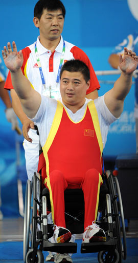 Chinese para-powerlifter Zhang Haidong waves to the audience after claiming the gold of the men's 82.5kg category at the Beijing Paralympic Games Sept. 15, 2008. [Xinhua]