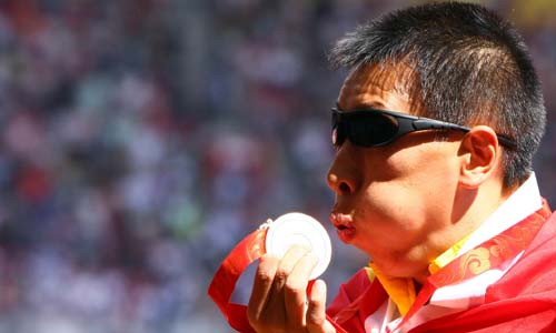 Li Duan of China celebrates after winning the final of the men's long jump F11 classification event at the 2008 Beijing Paralympic Games in Beijing on September 15, 2008.[Xinhua]