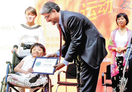 Yu is one of five individuals who received certificates from the United Nations in China yesterday for their services for the persons with disabilities.