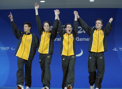 Matthew Cowdrey, Rick Pendleton, Peter Leek, Ben Austin (from R to L) of Australia cheer while hearing their names on the podium of the medal ceremony for the men's 4x100m medley 34 PTS final during the 2008 Beijing Paralympic Games at the National Aquatics Center in Beijing on September 15, 2008. Matthew Cowdrey, Rick Pendleton, Peter Leek, Ben Austin of Australia team won the champion. [Agencies]