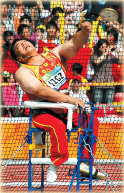 China's Fan Liang throws a discus during the men's discus F53/54 final competition. Fan won the gold medal in this category to mark a new world record of 31.08. AP