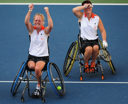 | The Netherland's Korie Homan (L) and Sharon Walraven (R) celebrate victory over compatriots Esther Vergeer and Jiske Griffioen in the women's wheelchair tennis doubles final during the 2008 Beijing Paralympic Games on September 15, 2008 at the Olympic Green Tennis Centre in Beijing.[Agencies] |