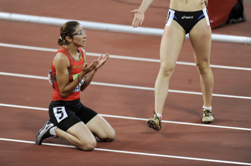 | Sanaa Benhama of Marocco (L) celebrates winning gold in the women's 200m T13 final during the 2008 Beijing Paralympic Games at the National Stadium on September 13, 2008.[Agencies] |