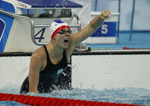 | Britain's Elizabeth Johnson celebrates after winning the gold medal in the women's 100M breaststroke SB6 finals at the Beijing 2008 Paralympic Games September 12, 2008.[Agencies] |