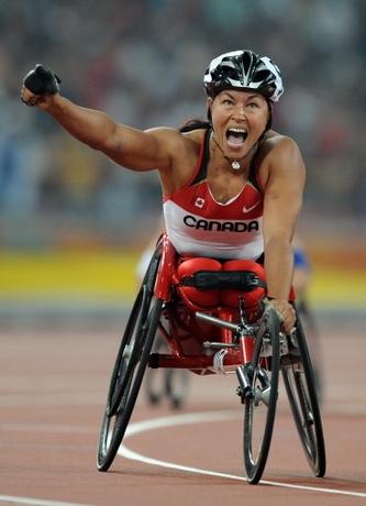 | Chantal Petitclerc of Canada celebrates after winning the final of the women's 800 metre T54 classification event at the 2008 Beijing Paralympic Games in Beijing on September 14, 2008. [Agencies] |
