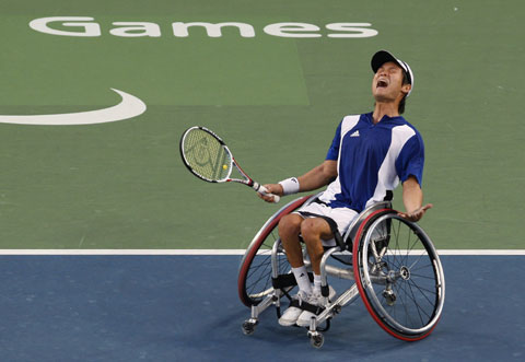 Japan's Shingo Kunieda celebrates after winning the gold medal against Netherlands' Robin Ammerlaan during the wheelchair tennis men's single finals at the Beijing 2008 Paralympic Games, September 15, 2008.[Agencies]