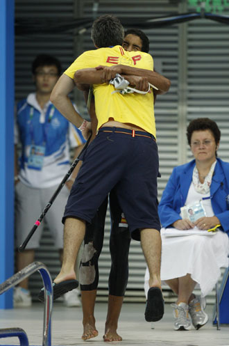 Spain's Enhamed Enhamed lifts his guide after winning the gold in the men's 100m freestyle S11 finals at the Beijing 2008 Paralympic Games, September 12, 2008.[Agencies]