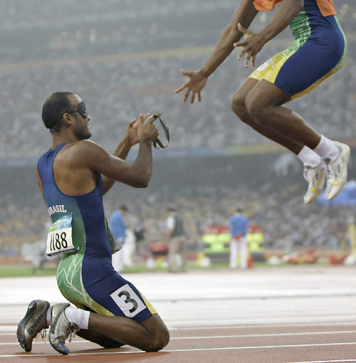 Brazil's Lucas Prado (L) celebrates with his guide after they won the Men's 100M T11 final at the National Stadium, also known as the Bird's Nest, during the Beijing 2008 Paralympic Games September 9, 2008. [Agencies]