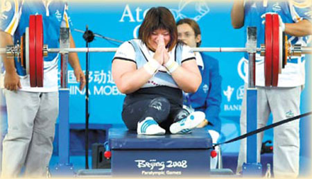 Chinese Taipei's Lin Tzu-hui celebrates her gold medal. She won in the women's -75kg powerlifting event September 14, 2008. [Agencies]