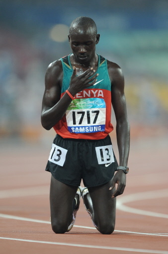 | Henry Kiprono Kirwa of Kenya crosses himself after winning the final of the men's 10000 metre T12 classification event at the 2008 Beijing Paralympic Games in Beijing on September 14, 2008. [Agencies] |