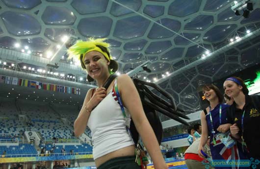 A Paralympic athlete smiles while walking in the National Aquatics Center or "Water Cube". The venue finished all the swimming events on September 15, 2008. [Sohu.com]