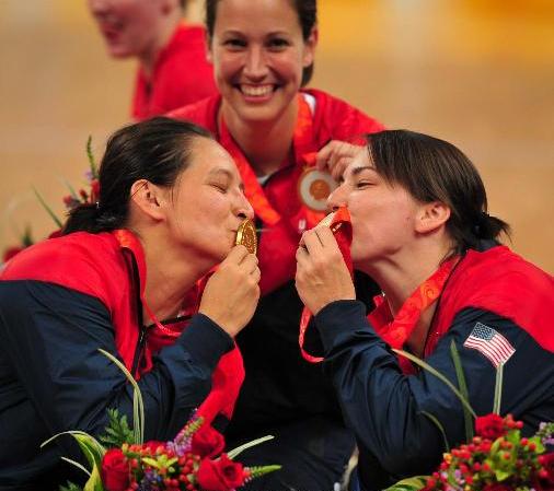 Players of the United States kiss the medals in the awarding ceremony of women's wheelchair basketball at the Beijing 2008 Paralympic Games in Beijing, September 15, 2008. USA won the match 50-38 and claimed the title of the event. [Xinhua]