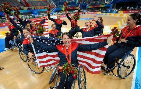 Players of the United States celebrate in the awarding ceremony of women's wheelchair basketball at the Beijing 2008 Paralympic Games in Beijing, September 15, 2008. USA won the match 50-38 and claimed the title of the event. [Xinhua]