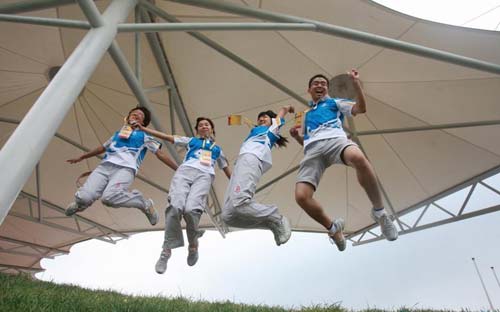 Paralympic volunteers jump into the air for a group photo in the Paralympic Village in Beijing September 16, 2008. The Beijing 2008 Paralympic Games will conclude on Wednesday. [Sohu.com]