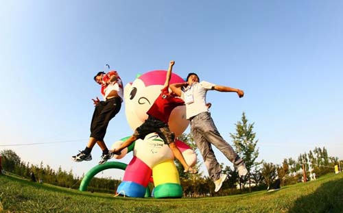 Paralympic volunteers jump into the air for a group photo in the Paralympic Village in Beijing September 16, 2008. The Beijing 2008 Paralympic Games will conclude on Wednesday. [Sohu.com]
