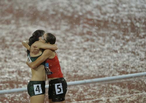 Sanaa Benhama of Morocco (R) hugs Ilse Hayes of South Africa after winning women's 100m T13 during the 2008 Beijing Paralympic Games at the National Stadium in Beijing on September 16, 2008. Sanaa Benhama won with a new world record of 12.28, Ilse Hayes took the silver medal.