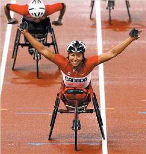 Canada's Chantal Petitclerc celebrates as she crosses the finish line during the athletics 1,500m T54 final. [Agencies]