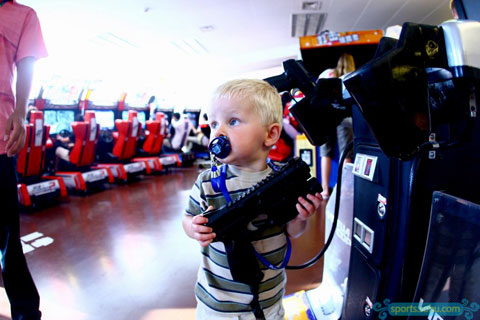 A toddler plays on a shooting game at the Paralympic Village on September 16, 2008. As the curtain prepares to fall on the Paralympics, there's a relaxed atmosphere in the Paralympic Village.[Sohu.com]